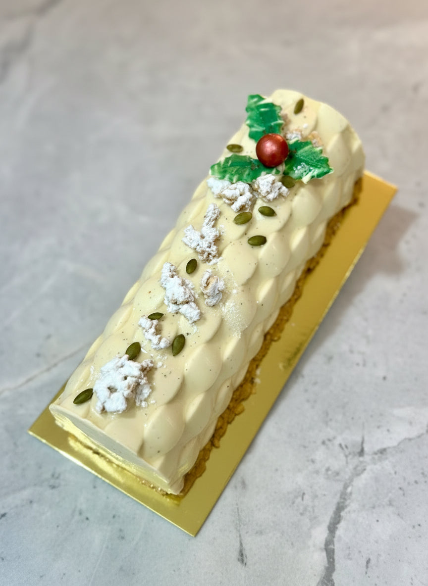 Serves 10 - Indulge in the perfect balance of flavours with our Earl Grey Lavender Log. Each bite is a delicate combination of creamy and crunchy textures filled with a luscious pumpkin seed praliné. Experience the soothing notes of Earl Grey and lavender, making this holiday log a must-have treat.